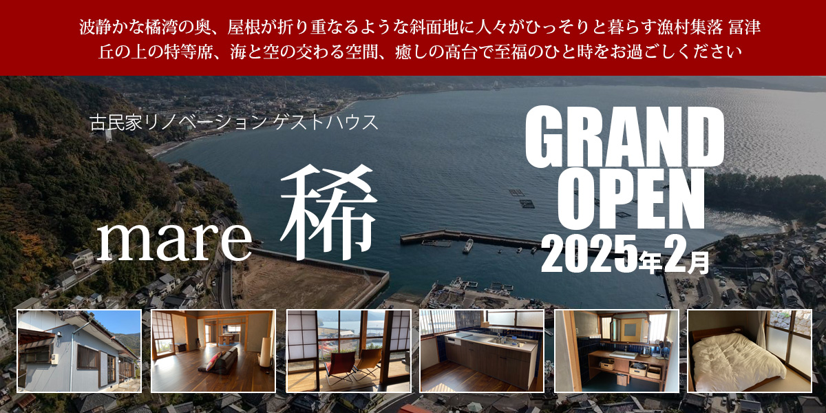 長崎県橘湾の入り江の奥にある「富津」という小さな漁村集落に、古民家をリノべー ションして2025年2月にオープンした一棟貸しの宿泊施設です。